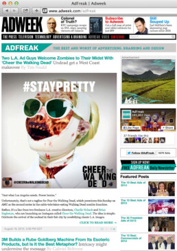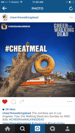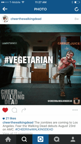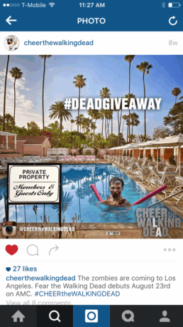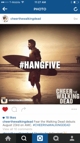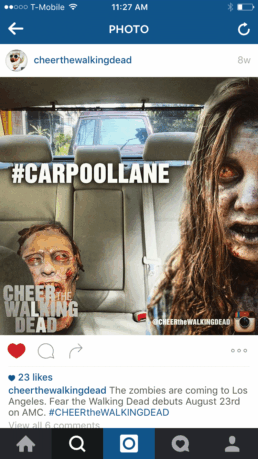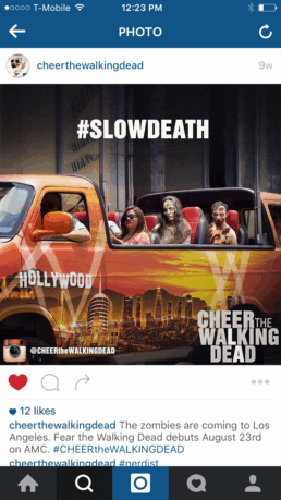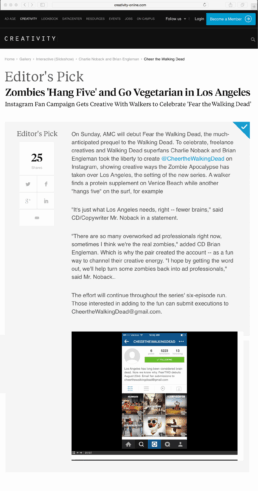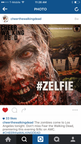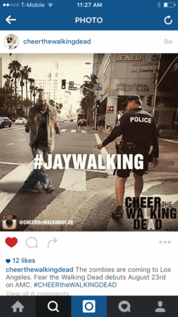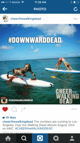 The zombies come to Los Angeles! We celebrate the premiere of Fear the Walking Dead by inventing an Instagram called Cheer the Walking Dead–and it gets a shoutout from none other than the illustrious Tim Nudd himself. The idea is simple: we champion the arrival of the undead to our fair city by zombifying classic L.A. tropes and destinations. The pilot episode received a total of 10.1 million viewers during its initial broadcast with 6.3 million in the advertiser-coveted 18-49 demographic, making Fear the Walking Dead the most-watched series premiere in basic cable television history!